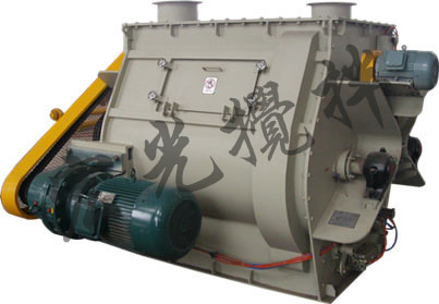 該機在w形的混合室內裝有一對以相反方向旋轉的軸,在每個軸上裝置具有視點、數量且呈堆疊狀的槳葉,在具有圓周速度的混合室內構成活動層,層內的物料在對流混合原理下進行混合,并在處于失重狀況,因此有均勻混合物。在容器上方亦可裝有噴液口,進行噴加液體的固-液混合。